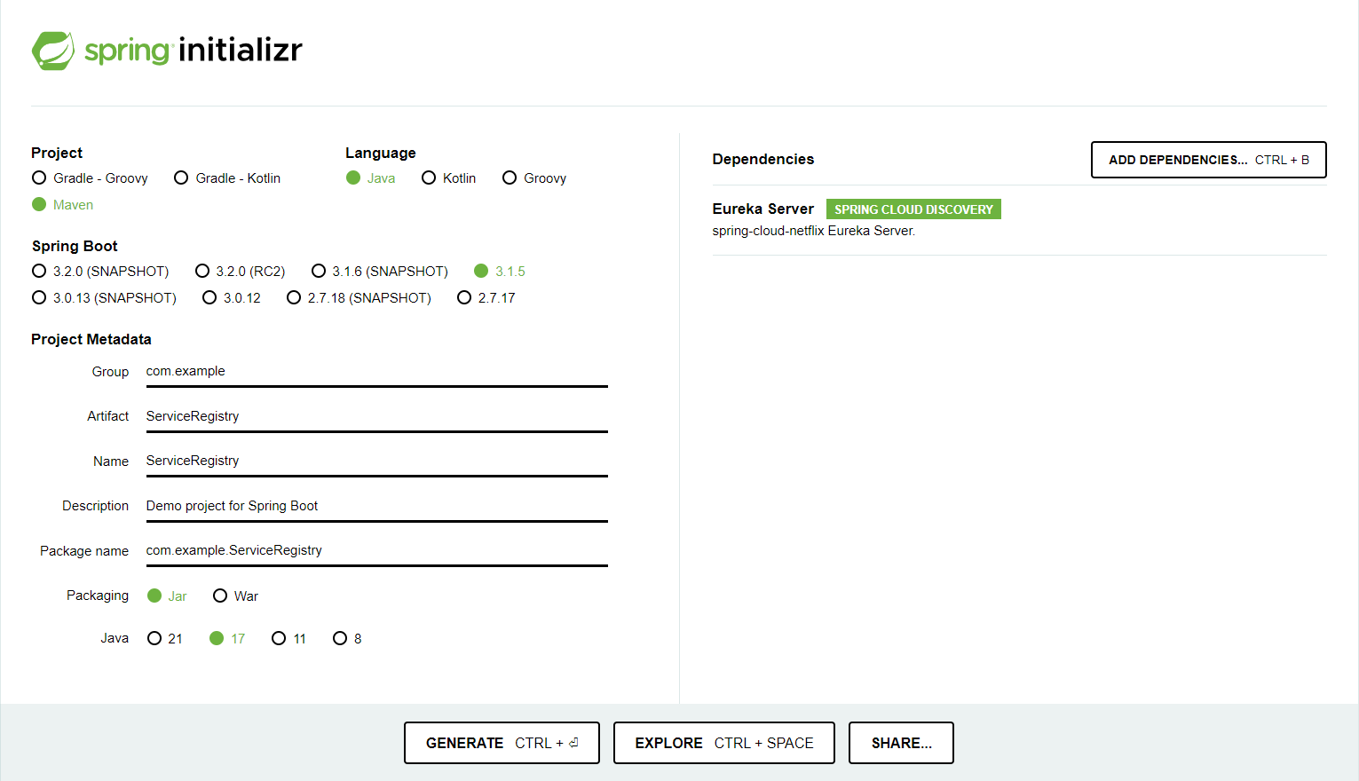 Step 1: Create new service for Service Registry with Eureka Server Dependency. Go to https://start.spring.io/ and create project with Eureka Server Cloud Dependency.