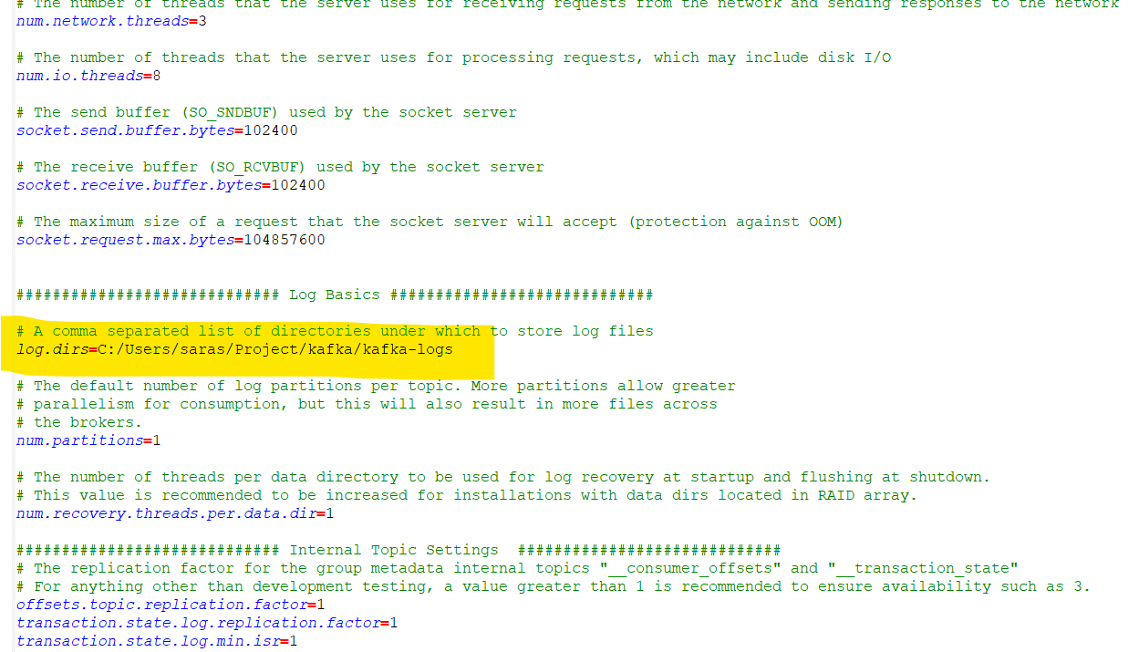 Step 3: Go to server.properties file (kafka>>config>>server.properties), open this file and scroll down to log.dirs and paste the path to. To the path add /kafka-logs.