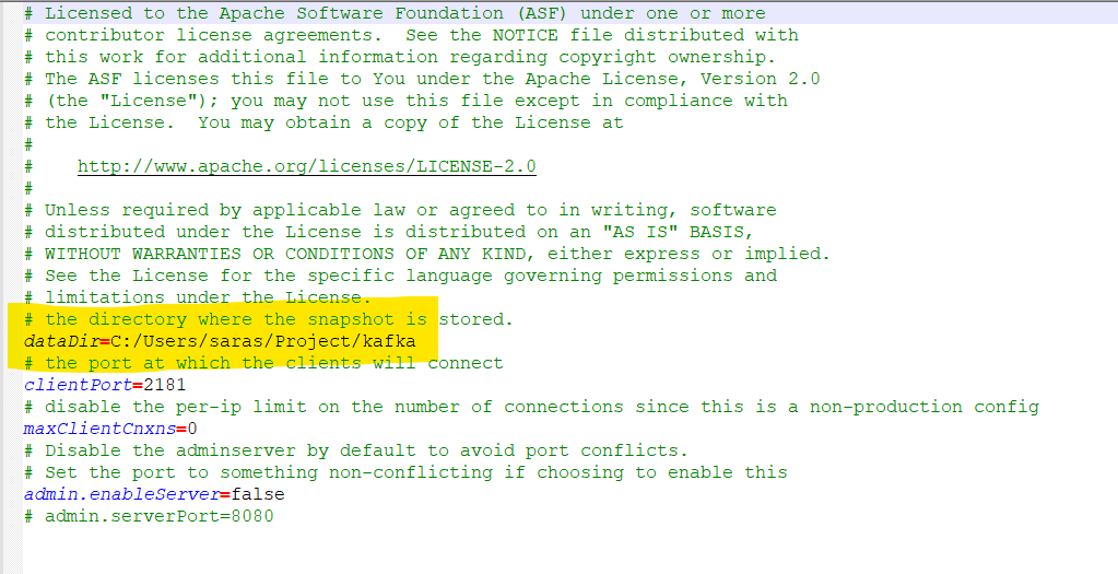 Step 2: Go to Zookeeper.properties file (kafka>>config>>zookeeper.properties), open this file and copy the path agaist the field dataDir and /zookeeper-data to the path.
